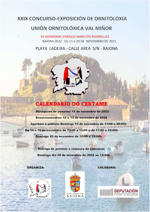 Ayer dia 20 de noviembre de 2011 se procedio a la clausura del XIX Concurso-Exposición de Ornitológia organizado por la Unión Ornitolóxica Val Miñor, desde esta pagina queremos agradecerle a todos los criadores y colaboradores su participación en el mismo y esperamos contar con vosotros en el XX concurso a celebrar el proximo año. Muchas gracias a todos.
